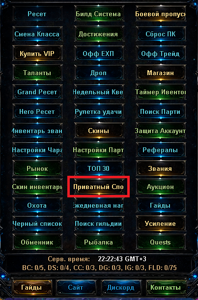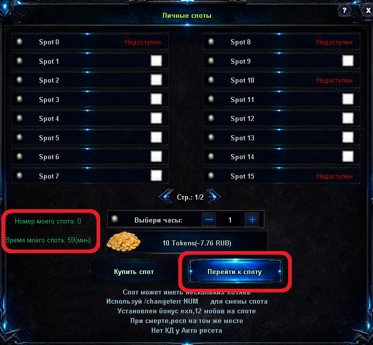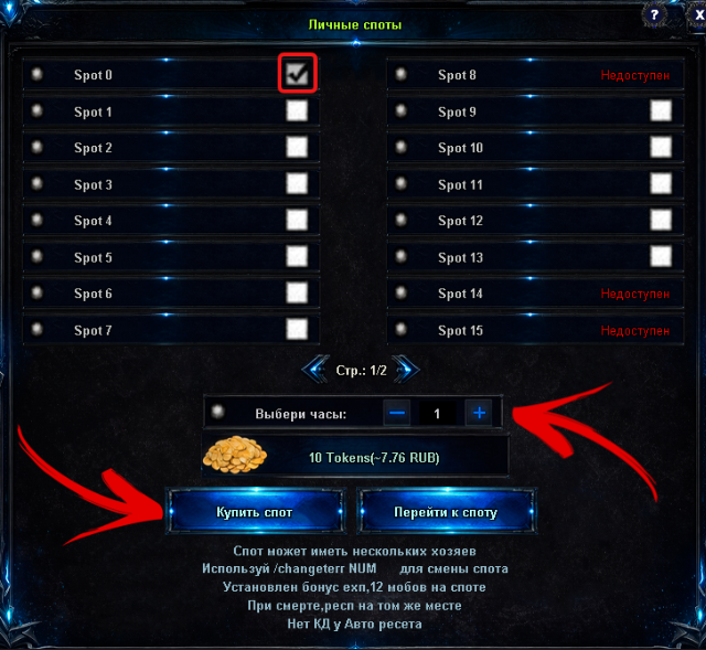 | После покупки возвращаемся в меню приватного спота, чтобы перейти на сам спот. | ||