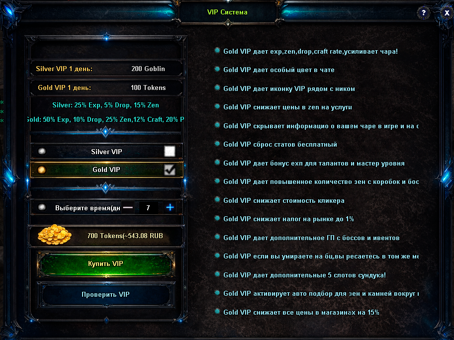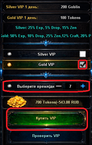 Стоимость SILVER VIP: 200 Goblin points / 1 день (24 часа) |