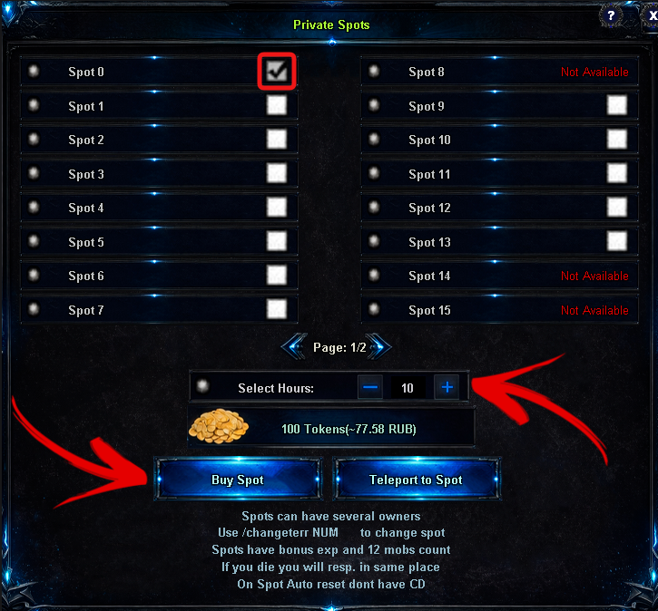 | After purchasing, return to the private spot menu to teleport to your spot. | ||